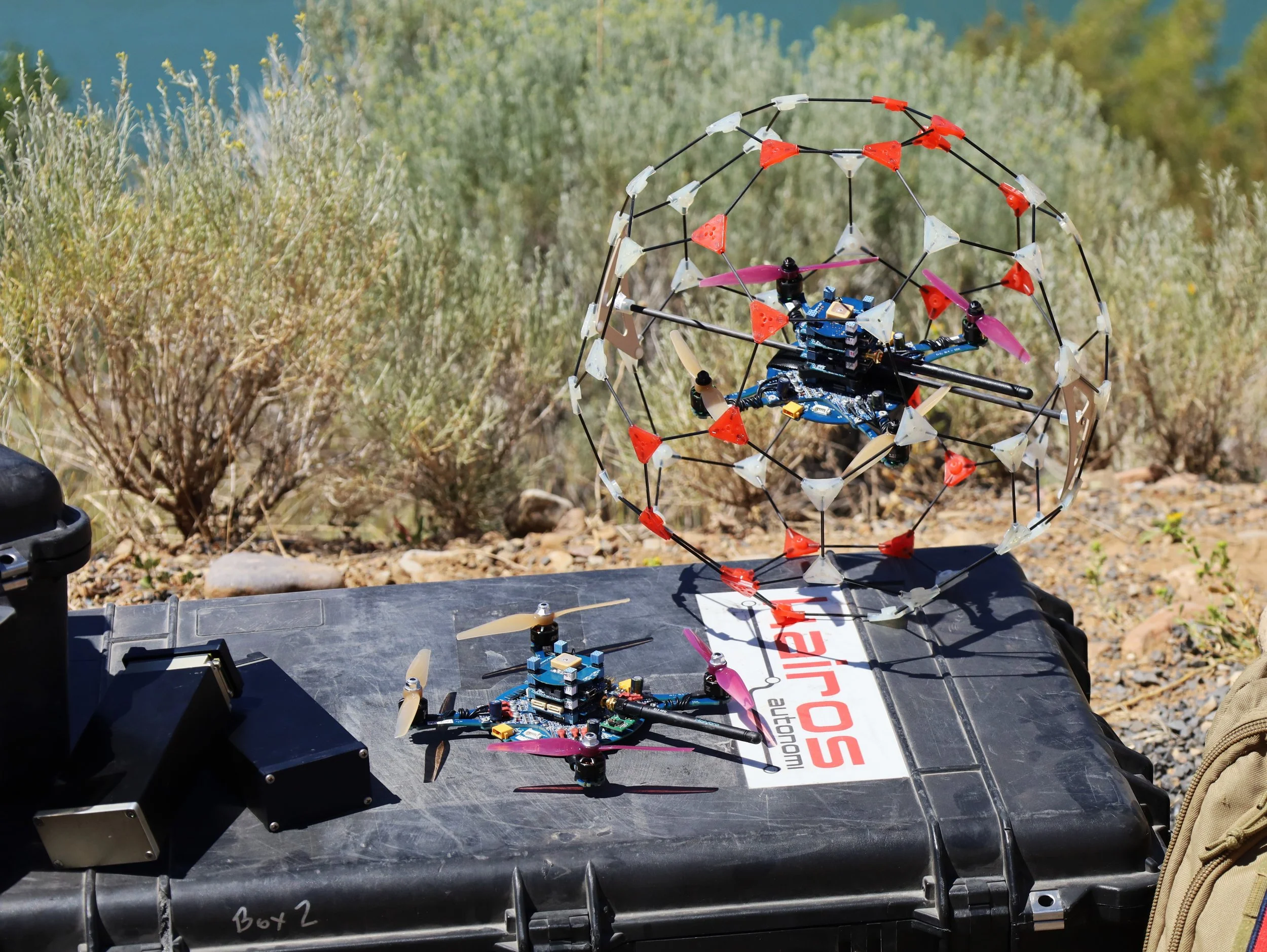 The Flight Basket UAS system utilizes the common Kairos Autonomi UxV/35 flight stack installed into a crash-resistant and collision-safe carbon-fiber polyhedron cage (the flight basket).